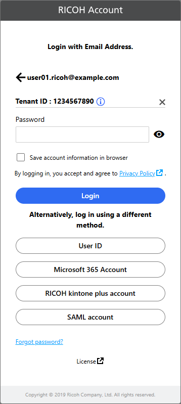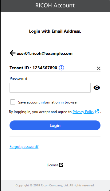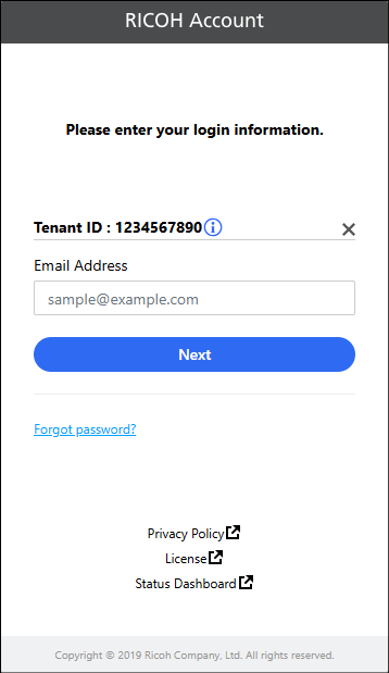 This section explains using the login screen when your tenant ID is set. If you login to another tenant, click [x] next to the tenant ID. And then enter the ID and log in when the ID will be cleared.