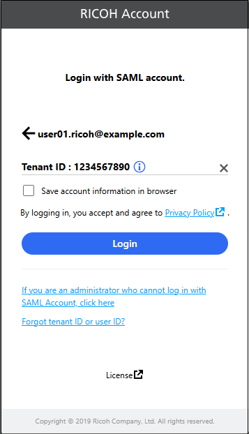 If the login method for your tenant specifies "SAML", use your SAML-linked ID provider account to log in.