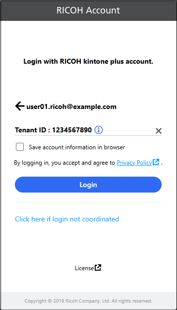 If the login method for your tenant specifies use of " RICOH kintone plus account", use your RICOH kintone plus account to log in.