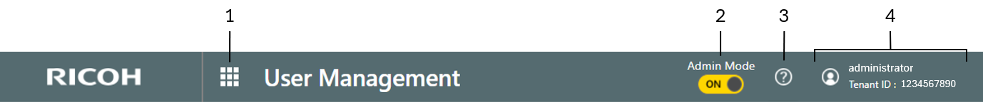 This button appears when logging in as a tenant administrator. Clicking to "ON", the display switches to Admin Mode. Administrators can set user management and application permission management for users and devices.