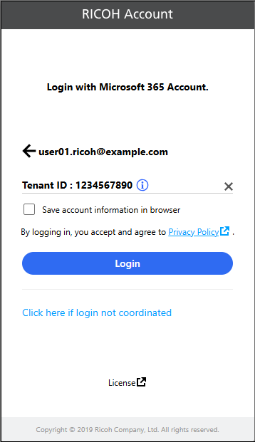 This section explains using the login screen when your tenant ID is set. If you login to another tenant, click [x] next to the tenant ID. And then enter the ID and log in when the ID will be cleared.