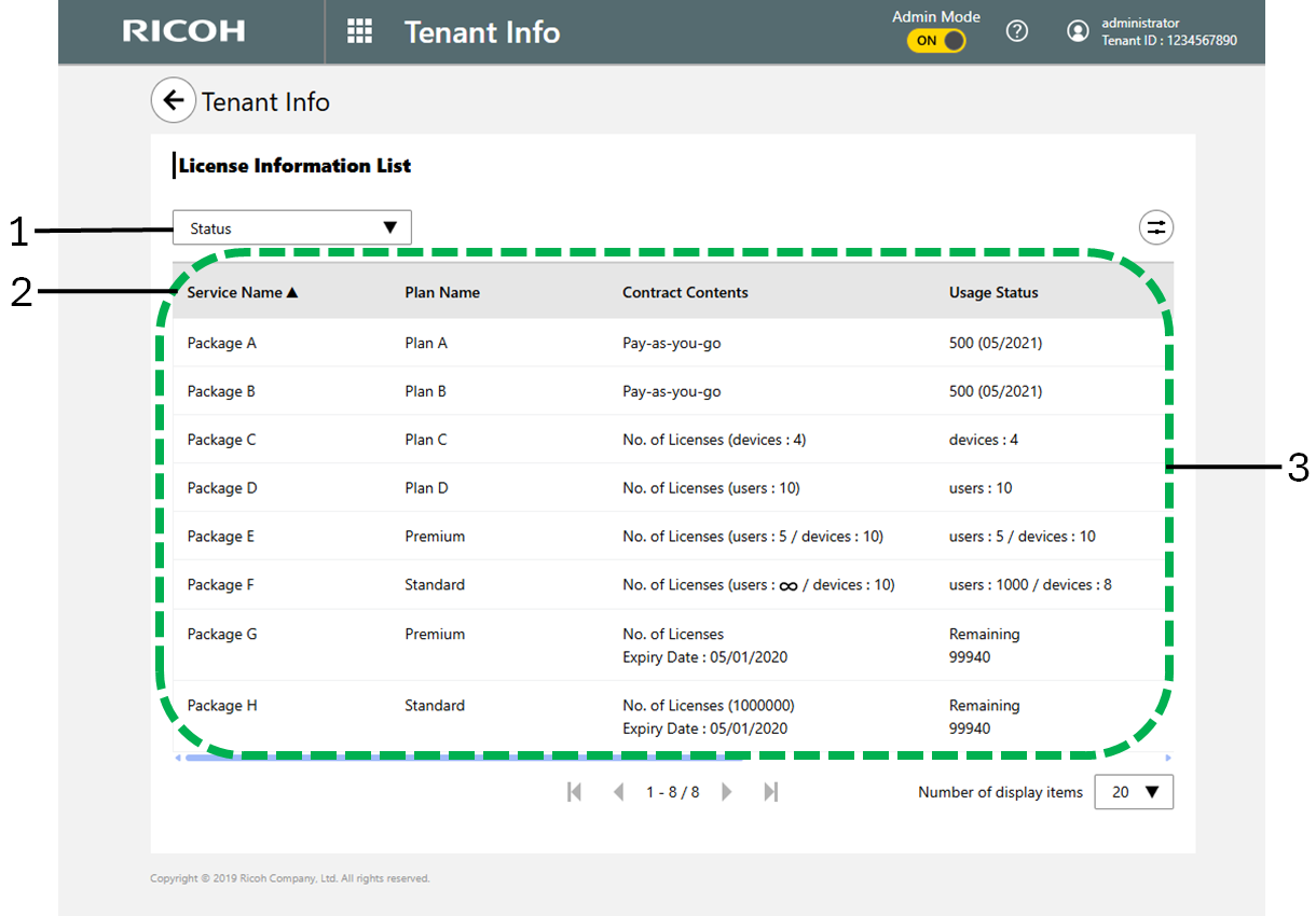 | License Information List | You can check a list of the services licensed to the tenant to which the user belongs, with their status. | |