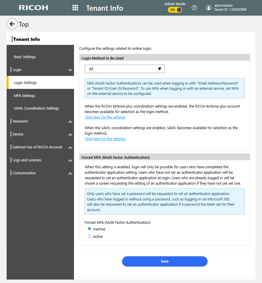 - MFA can be used to log in with a combination of "Email Address/Password" or "Tenant ID/User ID/Password". To use MFA for login with an external service, configure the MFA settings on the external service.