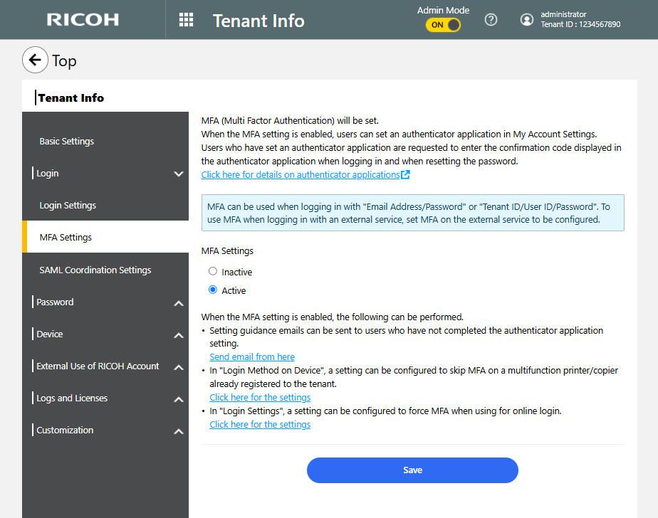 Click [Click here for the settings] to display the Login Method on Device screen. On this screen, you can configure whether or not to skip MFA on the tenant-registered multifunction printer. For information about how to configure this, see Login Method on Device.