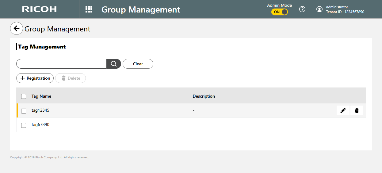 You can use Tag Management to register new tags for groups, and you can edit and delete existing tags. The administrator uses tags to identify groups more efficiently.
